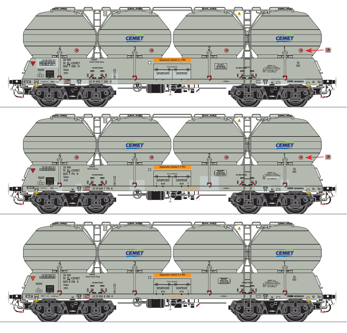 Zestaw trzech czteroosiowych wagonów specjalnych typu 408S (seria Uacs) należących do CEMET S.A..