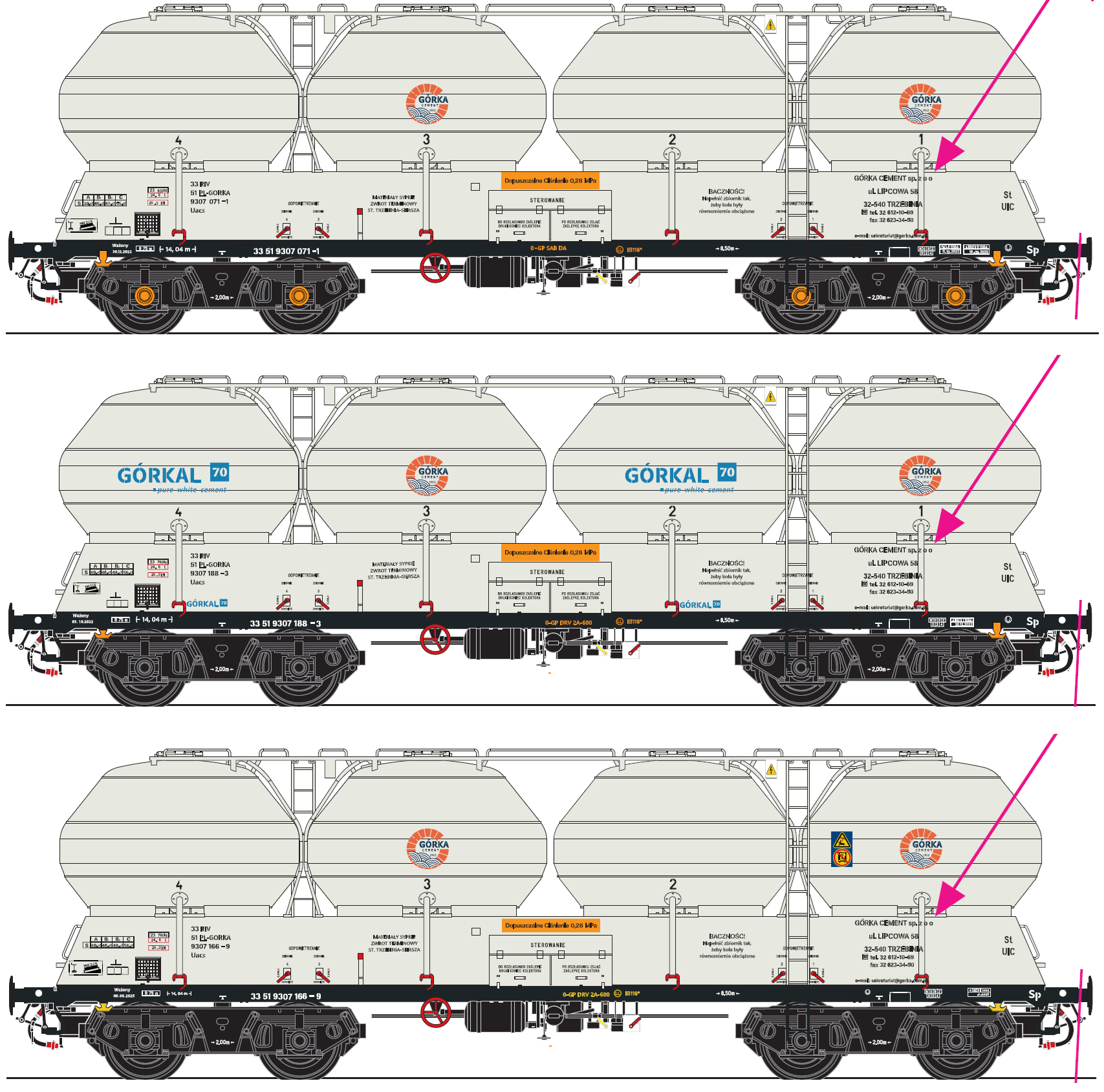 Zestaw trzech czteroosiowych wagonów specjalnych typu 408S (seria Uacs) należących do GÓRKAL.